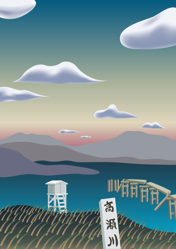 左手に見えてきた小川原湖から高瀬川が太平洋に注いでいます。その川の中に、小学校で見たような百葉箱が設置されているのを見つけました。なぜ川の中に? おそらく地元の漁師さんが漁のために使うのでしょう。朽ち果てた桟橋や、川の中に立つ「高瀬川」と書かれた看板も目に留まり、私はその風景に強く惹きつけられました。