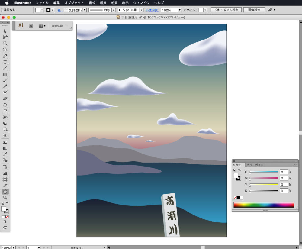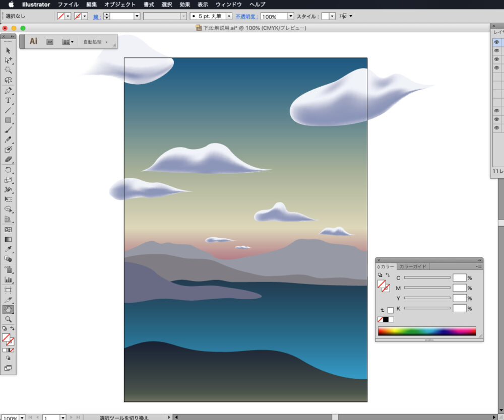 まずは右上の大きな雲から描き始めます。ドット絵とは異なる、シュールな形を意識してペンツールで形を作り、ベースの色をC6,M3,Y0,K0に設定します。