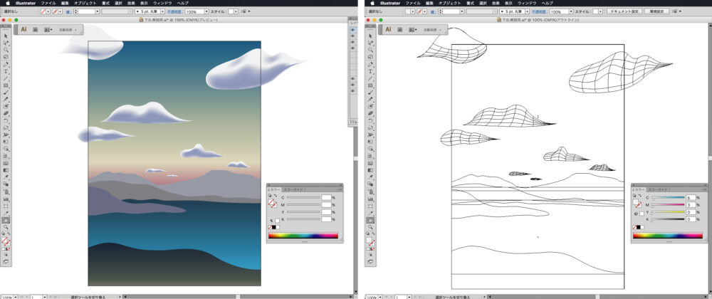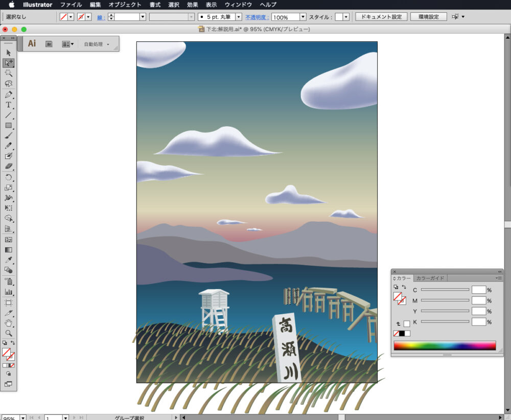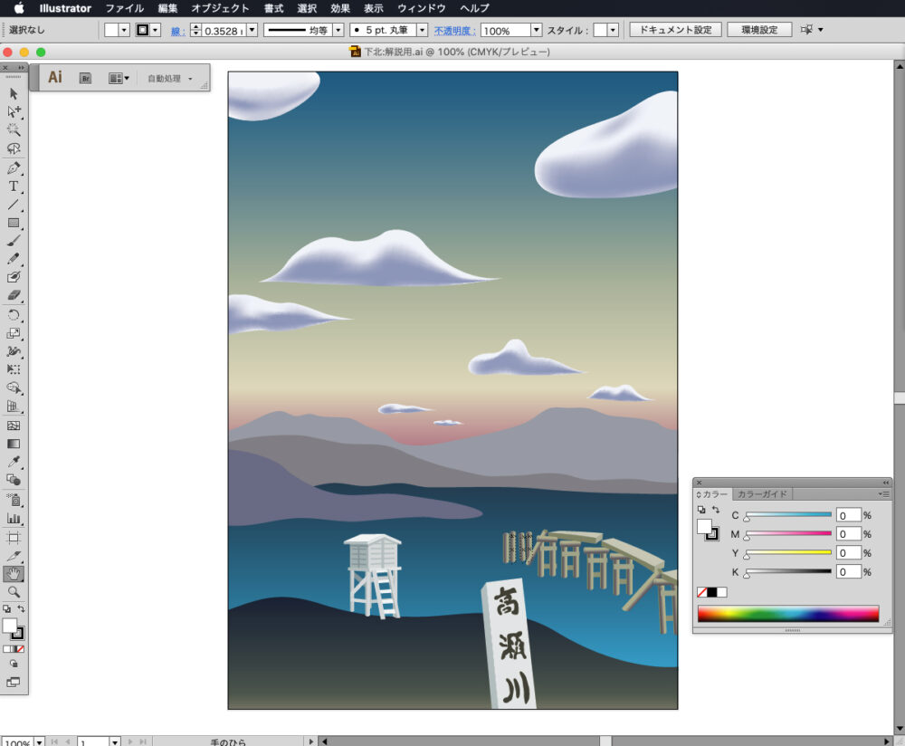 背景の一番奥にある山並みは、ペンツールでシンプルかつ様式的な形を描いていきます。色はC40,M30,Y20,K0に設定します。