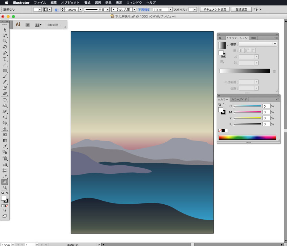 ペンツールで手前の岸の形を描き、グラデーションツールで3つの色を設定します。