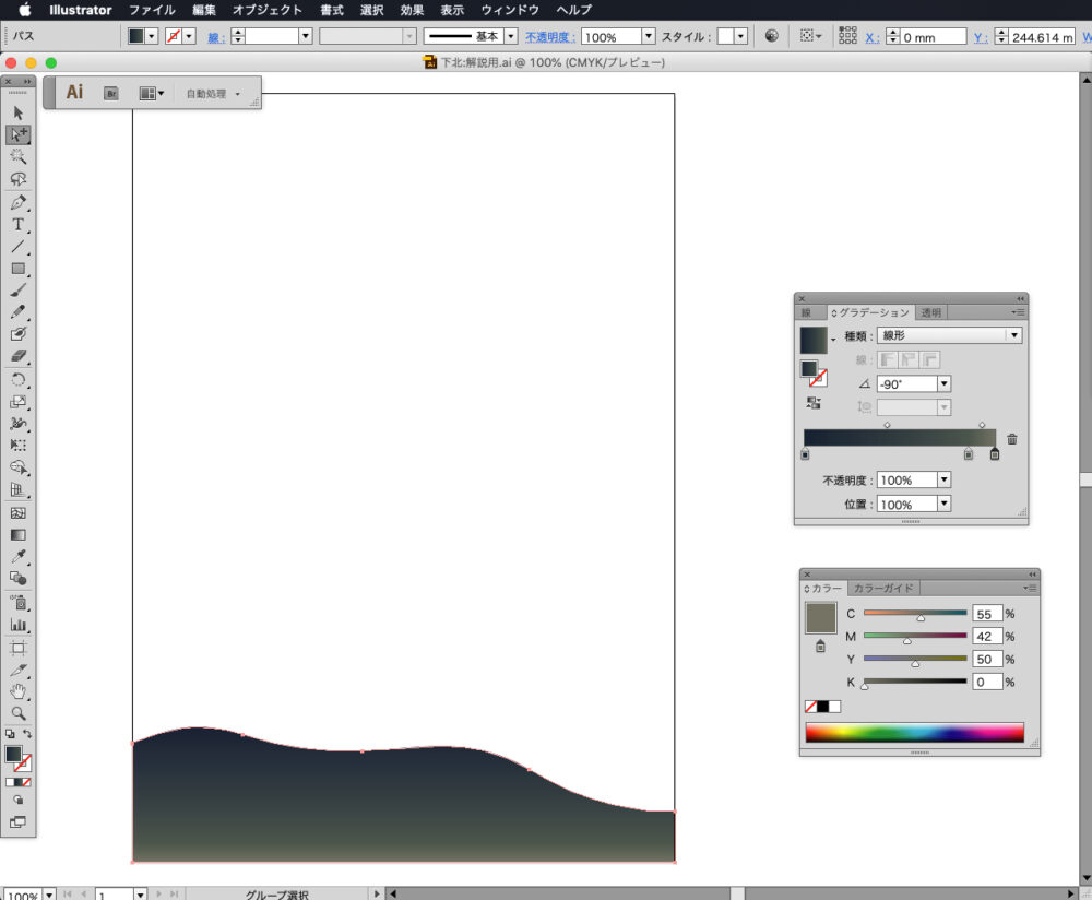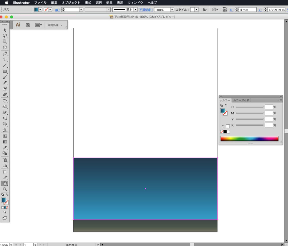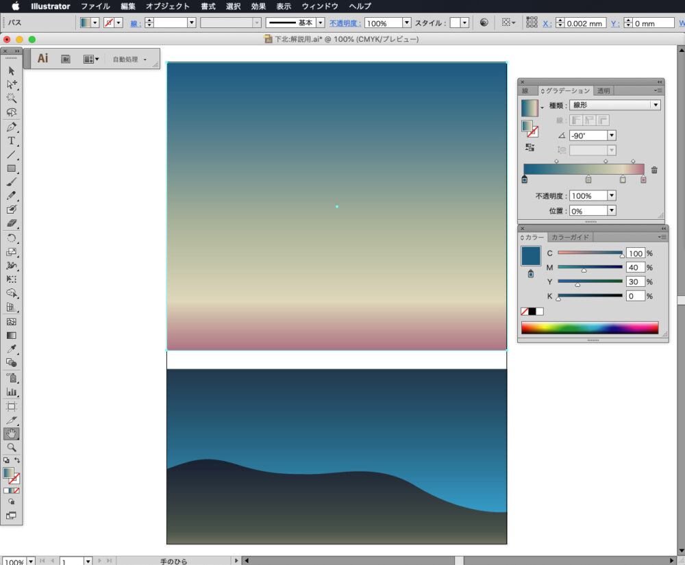 ここでもグラデーションツールを使い、左側をC85,M50,Y40,K30、右側をC100,M0,Y0,K0に設定します。上から下へ向かってShiftキーを押しながらドラッグしてグラデーションを適用します。