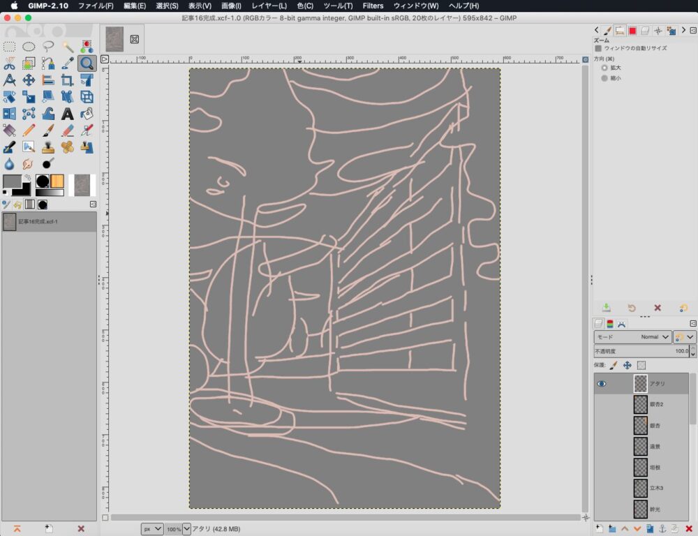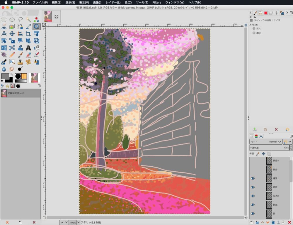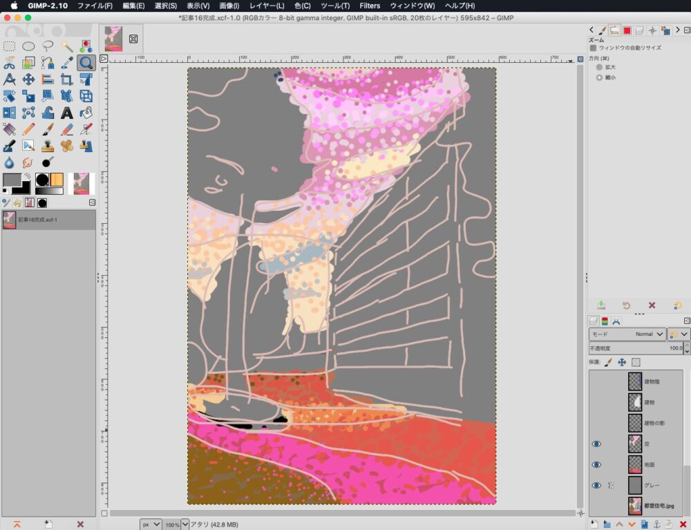 新たな表現の舞台に選んだのは、ドットを打つのに適した「GIMP 2.10」でした。A4の縦画面に、Illustratorで描いた構図と色彩を写し、そこから「変化」させていく。最大の課題は、あのくっきりとした色面の境目を、どうやって滑らかに繋いでいくかです。