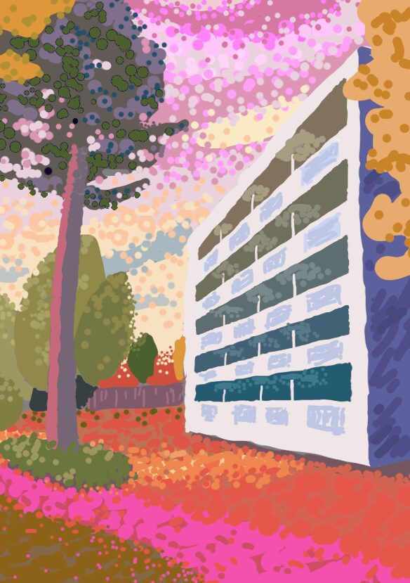 「芸術はビルド・アンド・クラッシュ、クラッシュ・アンド・ビルドだ」かつて私は、そんな威勢の良い言葉を口にしたことがありました。しかし、言葉とは裏腹に、私の筆は2ヶ月もの間、ぴたりと止まっていました。いわゆる、スランプです。次に何を、どう描けばいいのか。自らの中にある地図を失い、霧の中を彷徨う日々でした。そんな私を救い出してくれたのは、ある方から届いた、小さな催し物の案内状作成の依頼でした。「まずは、身近な風景から。そして、とにかくシンプルに」私は近所の団地の風景をスマホで切り取り、それを土台に、Adobe Illustratorで描き始めました。催し物のイメージに合わせて、現実の色を忘れ、明るくカラフルな世界を構築したのです。