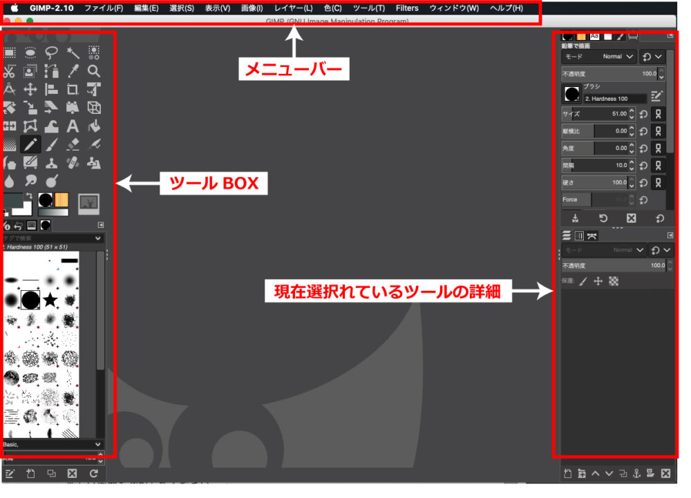今回使用するのは、メニューとツールのみです。もしツールボックスが表示されない場合は、メニューから GIMP 2.10 → 設定 → 左のサイドバーのツールボックス で、お好みのカスタマイズをしてください。