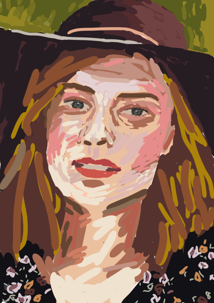 当初は髪をより細密に描き込む予定でした。しかし、ふと手を止めました。この大胆で力強いタッチこそが、彼女の持つ「都会に染まらないカントリーな力強さ」を最も雄弁に語っていると感じたからです。