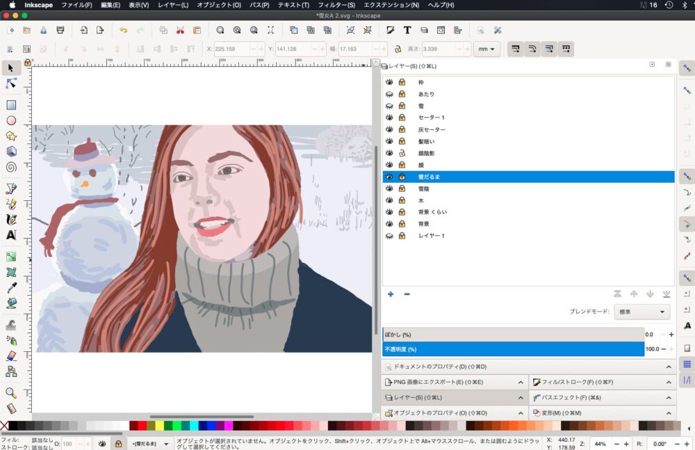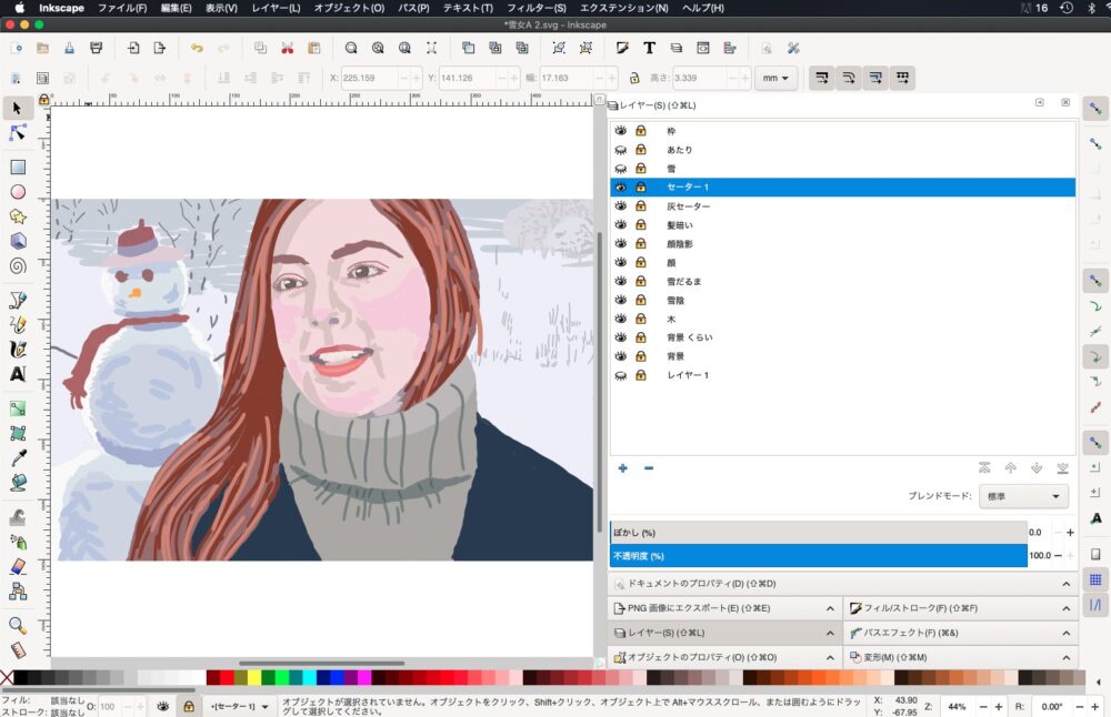 失敗を恐れず、しかしリスクは最小限に。自分にそう言い聞かせ、合計14枚のレイヤーを積み重ねました。顔、髪、セーター、上着……。それぞれの色彩が互いに響き合い、最も美しいメロディを奏でる場所を慎重に探りながら、アウトラインを少しずつ整理されたラインへと磨き上げていきました。