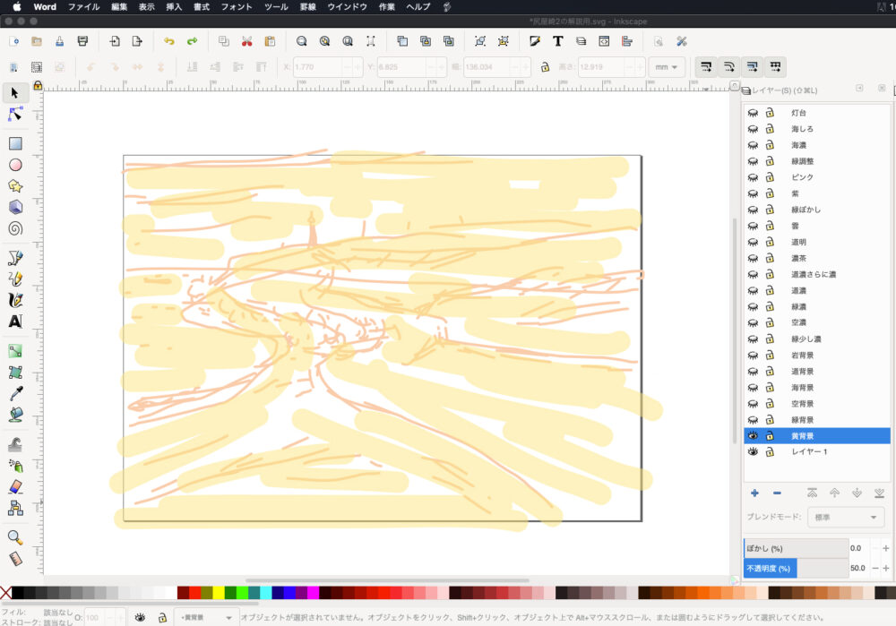 下絵が透けて見えるように、レイヤーの不透明度を50%に設定します。