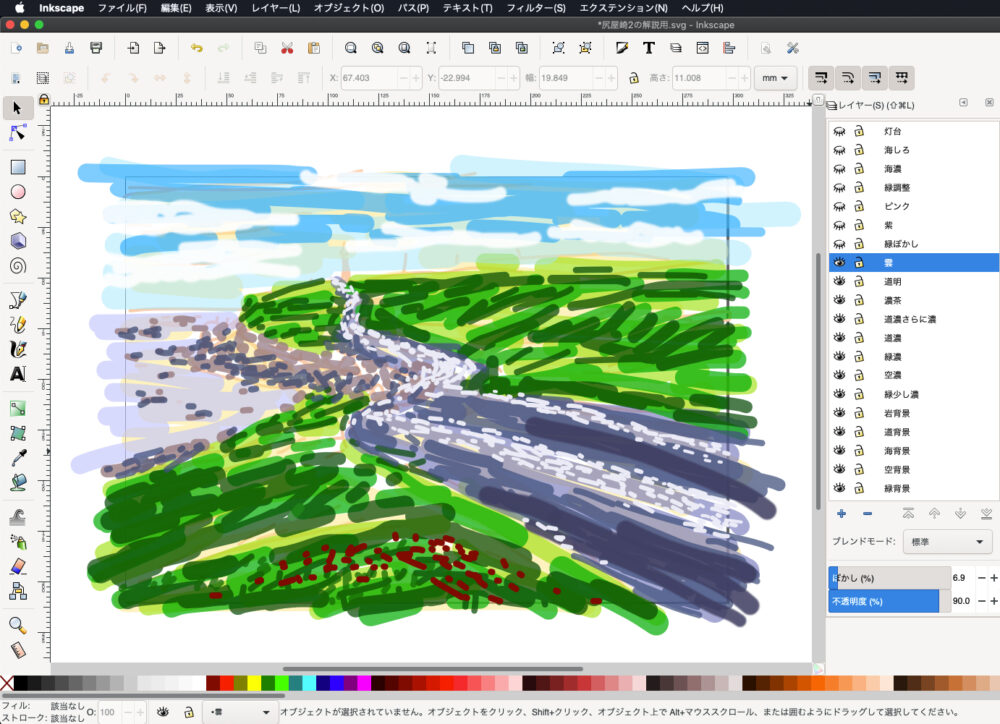 雲は、カリグラフィツールで描くだけでは雰囲気を出すのが難しいので、レイヤーに「ぼかし」の設定を加えましょう。