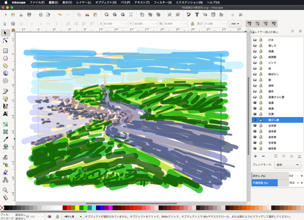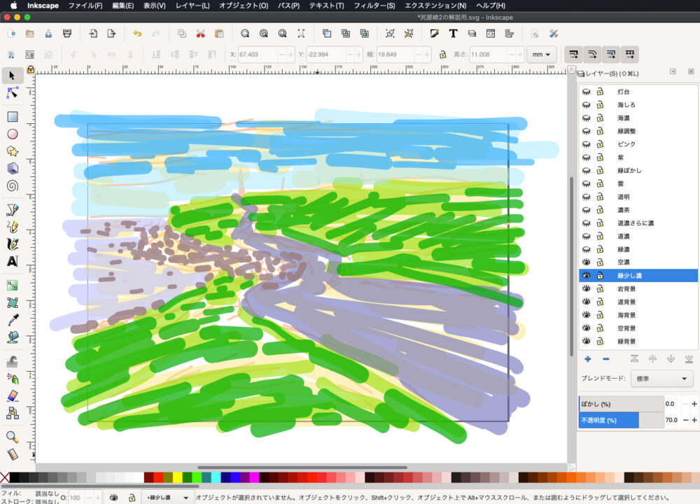 平面的に見える牧草に、濃い緑で陰影をつけます。また、道の暗い部分も描き進めましょう。下のレイヤーの色を活かすため、これらのレイヤーの不透明度は60%〜70%に設定します。