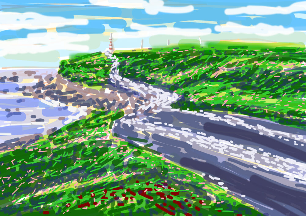 最後に、遠景の灯台を描きます。実際の尻屋崎灯台は真っ白ですが、ここではあえて描きやすい赤と白の縞模様にしてみました。