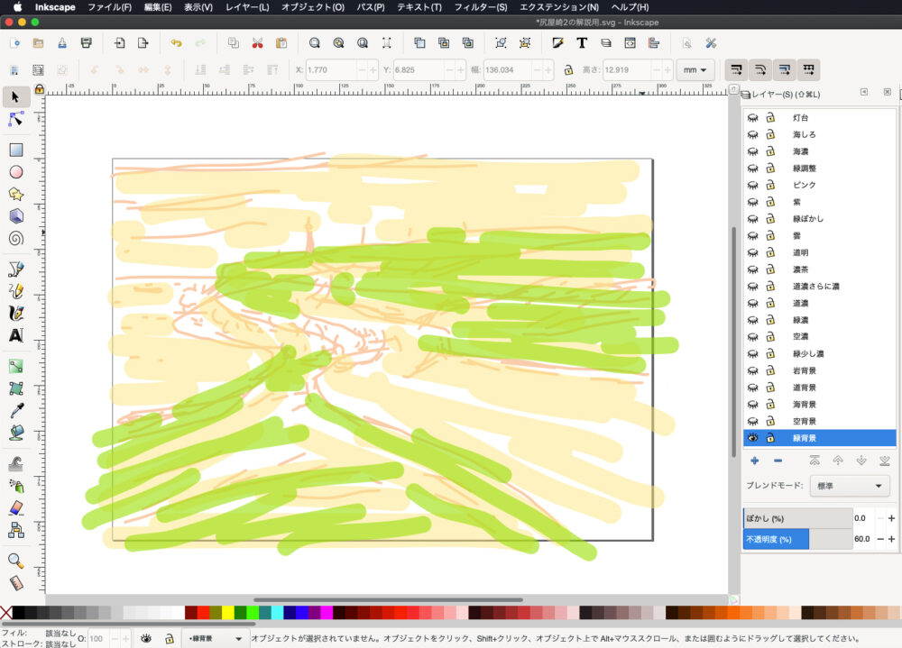 不透明度を60%に設定し、カリグラフィツールの幅を「30」くらいに少し狭くして、丘を覆う草を描きます。