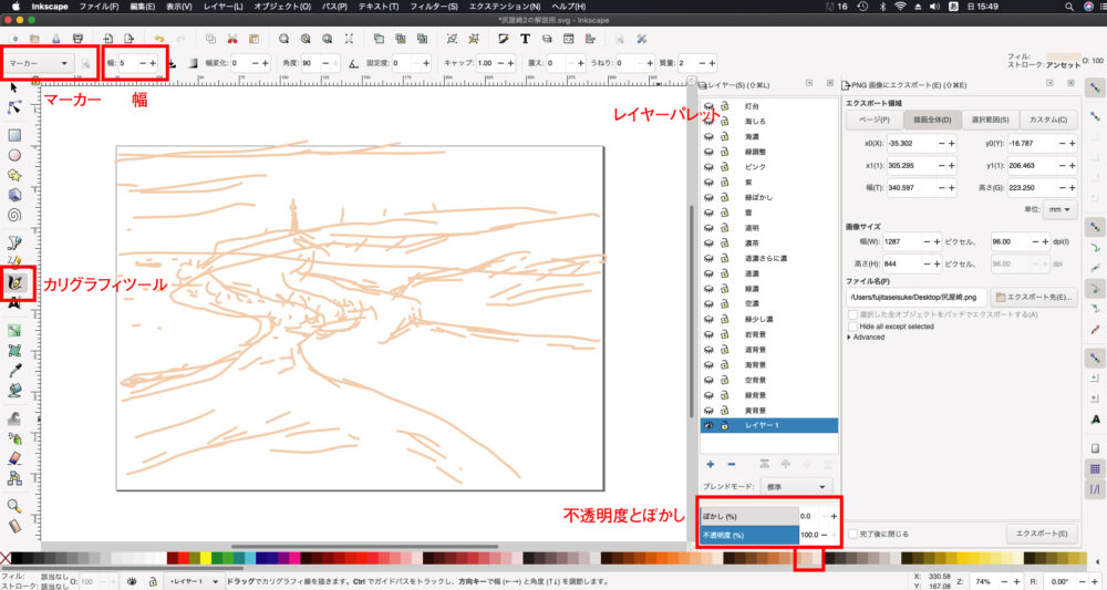今回は「万年筆のアイコン」のカリグラフィツールのみを使用し、色鉛筆やマーカーで絵を描くような感覚で進めていきます。