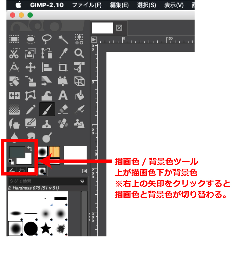 すると、描画色/背景色ツールの、上になっている部分が赤に変わります。上になっている色が描画色で、下になっているのが背景色です。このアイコンの右上の矢印になっているマークをクリックすると、描画色と背景色が入れ替わります。
