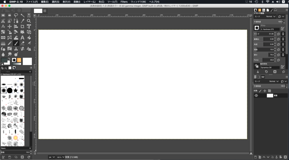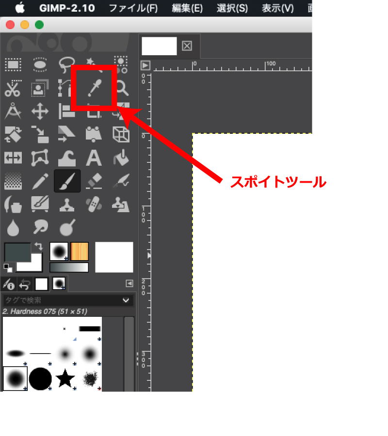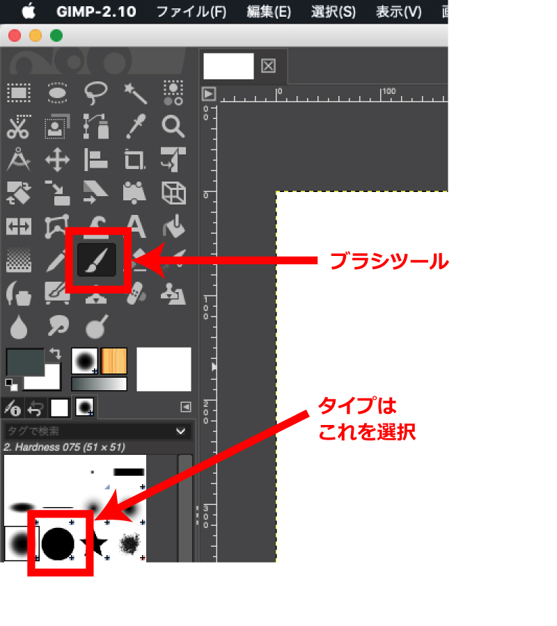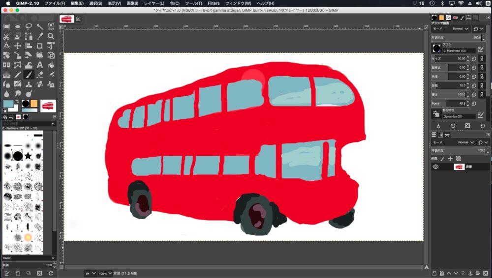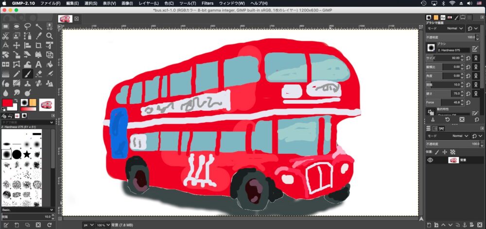 私はバスの全体の形から描いていきたいので、ツールボックスからブラシツール(筆のアイコン)を選択します。次に、その下のブラシのタイプで、境界線がはっきりした丸型のブラシタイプを選択します。