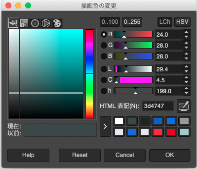 上の図のように、ツールボックスの下の方にある描画色/背景色ツール(重なった四角のアイコン)をクリックまたはダブルクリックすると、次のような小さなウィンドウが現れます。