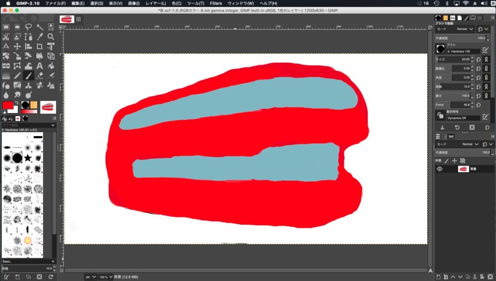これで一応完成です。保存する際は、メニューのファイルから名前をつけてエクスポートを選んで保存してください。そうすると、ホームページなどで使える.pngという拡張子のついたファイルになります。GIMPをそのまま保存すると.xcfという拡張子になり、後から修正したい場合は、この「.xcf」ファイルを開いて作業を続けることになります。