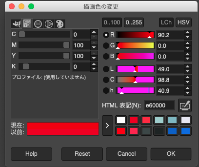 それぞれの欄に、C0、M100、Y100、K0と数字を入力してReturnキーを押すと、赤が表示されます。